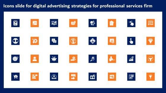Introducing our well designed Icons Slide For Digital Advertising Strategies For Professional Services Firm Template Pdf set of slides. The slide displays editable icons to enhance your visual presentation. The icons can be edited easily. So customize according to your business to achieve a creative edge. Download and share it with your audience. Our Icons Slide For Digital Advertising Strategies For Professional Services Firm Template Pdf are topically designed to provide an attractive backdrop to any subject. Use them to look like a presentation pro.