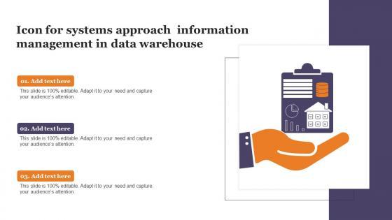 Pitch your topic with ease and precision using this Icon For Systems Approach Information Management In Data Warehouse Diagrams Pdf This layout presents information on Icon For Systems Approach, Information Management, Data Warehouse It is also available for immediate download and adjustment. So, changes can be made in the color, design, graphics or any other component to create a unique layout. Our Icon For Systems Approach Information Management In Data Warehouse Diagrams Pdf are topically designed to provide an attractive backdrop to any subject. Use them to look like a presentation pro.