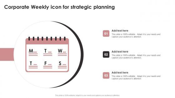 Pitch your topic with ease and precision using this Corporate Weekly Icon For Strategic Planning Template Pdf. This layout presents information on Corporate Weekly Icon, Strategic Planning. It is also available for immediate download and adjustment. So, changes can be made in the color, design, graphics or any other component to create a unique layout. Our Corporate Weekly Icon For Strategic Planning Template Pdf are topically designed to provide an attractive backdrop to any subject. Use them to look like a presentation pro.
