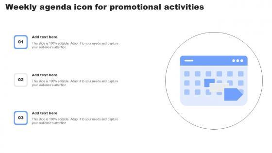 Showcasing this set of slides titled Weekly Agenda Icon For Promotional Activities Download Pdf The topics addressed in these templates are Weekly agenda icon, promotional activities All the content presented in this PPT design is completely editable. Download it and make adjustments in color, background, font etc. as per your unique business setting. Our Weekly Agenda Icon For Promotional Activities Download Pdf are topically designed to provide an attractive backdrop to any subject. Use them to look like a presentation pro.