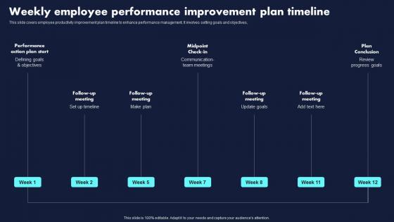 This slide covers employee productivity improvement plan timeline to enhance performance management. It involves setting goals and objectives.This Weekly Employee Performance Improvement Proven Techniques For Enhancing Icons Pdf is perfect for any presentation, be it in front of clients or colleagues. It is a versatile and stylish solution for organizing your meetings. The product name features a modern design for your presentation meetings. The adjustable and customizable slides provide unlimited possibilities for acing up your presentation. Slidegeeks has done all the homework before launching the product for you. So, do not wait, grab the presentation templates today This slide covers employee productivity improvement plan timeline to enhance performance management. It involves setting goals and objectives.