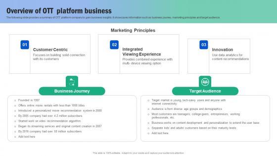 The following slide provides a summary of OTT platform company to gain business insights. It showcases information such as business journey, marketing principles and target audience If you are looking for a format to display your unique thoughts, then the professionally designed Guide For Segmenting And Formulating Overview Guide For Segmenting And Formulating Icons Pdf is the one for you. You can use it as a Google Slides template or a PowerPoint template. Incorporate impressive visuals, symbols, images, and other charts. Modify or reorganize the text boxes as you desire. Experiment with shade schemes and font pairings. Alter, share or cooperate with other people on your work. Download Guide For Segmenting And Formulating Overview Guide For Segmenting And Formulating Icons Pdf and find out how to give a successful presentation. Present a perfect display to your team and make your presentation unforgettable. The following slide provides a summary of OTT platform company to gain business insights. It showcases information such as business journey, marketing principles and target audience
