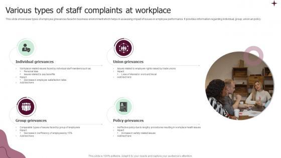 This slide showcases types of employee grievances faced in business environment which helps in assessing impact of issues in employee performance. It provides information regarding individual, group, union an policy. Showcasing this set of slides titled Various Types Of Staff Complaints At Workplace Icons Pdf. The topics addressed in these templates are Individual Grievances, Union Grievances, Policy Grievances. All the content presented in this PPT design is completely editable. Download it and make adjustments in color, background, font etc. as per your unique business setting. This slide showcases types of employee grievances faced in business environment which helps in assessing impact of issues in employee performance. It provides information regarding individual, group, union an policy.