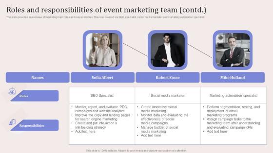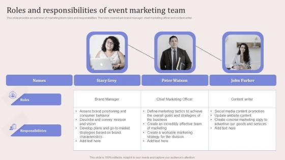 This slide provides an overview of marketing team roles and responsibilities. The roles covered are brand manager, chief marketing officer and content writer. The best PPT templates are a great way to save time, energy, and resources. Slidegeeks have 100 percent editable powerpoint slides making them incredibly versatile. With these quality presentation templates, you can create a captivating and memorable presentation by combining visually appealing slides and effectively communicating your message. Download Roles And Responsibilities Of Event Marketing Team Virtual Event Promotion To Capture Ideas Pdf from Slidegeeks and deliver a wonderful presentation. This slide provides an overview of marketing team roles and responsibilities. The roles covered are brand manager, chief marketing officer and content writer.