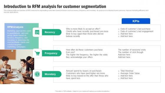 This slide provides an overview of RFM analysis for segmenting customers based on factors such as recency, frequency and monetary. Its purpose is to develop buyers persona, improve marketing efficiency and execute applications. The best PPT templates are a great way to save time, energy, and resources. Slidegeeks have 100 percent editable powerpoint slides making them incredibly versatile. With these quality presentation templates, you can create a captivating and memorable presentation by combining visually appealing slides and effectively communicating your message. Download Introduction To RFM Analysis For Customer Segmentation Guide For Segmenting And Formulating Ideas Pdf from Slidegeeks and deliver a wonderful presentation. This slide provides an overview of RFM analysis for segmenting customers based on factors such as recency, frequency and monetary. Its purpose is to develop buyers persona, improve marketing efficiency and execute applications.