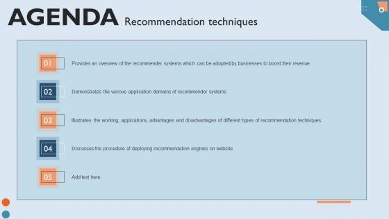 Find a pre-designed and impeccable Agenda Recommendation Techniques Ideas PDF. The templates can ace your presentation without additional effort. You can download these easy-to-edit presentation templates to make your presentation stand out from others. So, what are you waiting for Download the template from Slidegeeks today and give a unique touch to your presentation. Our Agenda Recommendation Techniques Ideas PDF are topically designed to provide an attractive backdrop to any subject. Use them to look like a presentation pro.