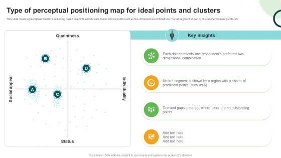 This slide covers a perpetual map for positioning based on points and clustered. It also includes such as two-dimensional combinations, market segment shown by cluster of prominent points, etc.Presenting this PowerPoint presentation, titled Positioning Techniques To Improve Type Of Perceptual Positioning Map Ideal Points And Clusters Graphics PDF, with topics curated by our researchers after extensive research. This editable presentation is available for immediate download and provides attractive features when used. Download now and captivate your audience. Presenting this Positioning Techniques To Improve Type Of Perceptual Positioning Map Ideal Points And Clusters Graphics PDF. Our researchers have carefully researched and created these slides with all aspects taken into consideration. This is a completely customizable Positioning Techniques To Improve Type Of Perceptual Positioning Map Ideal Points And Clusters Graphics PDF that is available for immediate downloading. Download now and make an impact on your audience. Highlight the attractive features available with our PPTs.