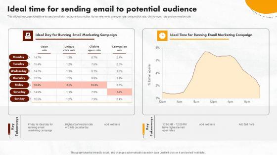 This slide showcases ideal time to send emails for restaurant promotion. Its key elements are open rate, unique click rate, click to open rate and conversion rate This modern and well arranged Online Promotional Activities Ideal Time For Sending Email To Icons Pdf provides lots of creative possibilities. It is very simple to customize and edit with the Powerpoint Software. Just drag and drop your pictures into the shapes. All facets of this template can be edited with Powerpoint no extra software is necessary. Add your own material, put your images in the places assigned for them, adjust the colors, and then you can show your slides to the world, with an animated slide included. This slide showcases ideal time to send emails for restaurant promotion. Its key elements are open rate, unique click rate, click to open rate and conversion rate