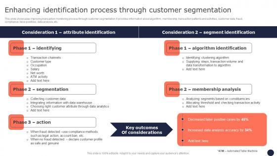 This slide showcases improving transaction monitoring process through customer segmentation. It provides information about algorithm , membership, transaction patterns and activities, customer data, fraud, compliance, false positives, data analysis, etc. If your project calls for a presentation, then Slidegeeks is your go-to partner because we have professionally designed, easy-to-edit templates that are perfect for any presentation. After downloading, you can easily edit Enhancing Identification Process Through Customer Mitigating Corporate Scams And Robberies Sample Pdf and make the changes accordingly. You can rearrange slides or fill them with different images. Check out all the handy templates This slide showcases improving transaction monitoring process through customer segmentation. It provides information about algorithm , membership, transaction patterns and activities, customer data, fraud, compliance, false positives, data analysis, etc.