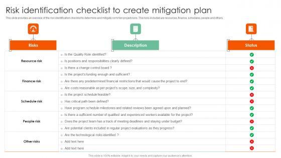 This slide provides an overview of the risk identification checklist to determine and mitigate common project risks. The risks included are resources, finance, schedules, people and others. Slidegeeks has constructed Project Risk Management And Reduction Risk Identification Checklist To Create Mitigation Plan Template PDF after conducting extensive research and examination. These presentation templates are constantly being generated and modified based on user preferences and critiques from editors. Here, you will find the most attractive templates for a range of purposes while taking into account ratings and remarks from users regarding the content. This is an excellent jumping-off point to explore our content and will give new users an insight into our top notch PowerPoint Templates.