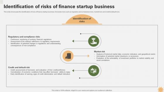This slide showcases the identification of risks of finance startup business. It includes risks such as regulatory and compliance risks, market risks and credit and default risks. Make sure to capture your audiences attention in your business displays with our gratis customizable Identification Of Risks Of Finance Startup Business Penetrating Markets With Financial Strategy SS V. These are great for business strategies, office conferences, capital raising or task suggestions. If you desire to acquire more customers for your tech business and ensure they stay satisfied, create your own sales presentation with these plain slides. This slide showcases the identification of risks of finance startup business. It includes risks such as regulatory and compliance risks, market risks and credit and default risks.