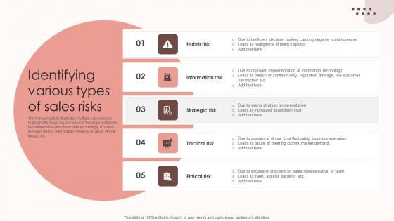 The following slide illustrates multiple sales risks to highlight the major issues faced by the organization for formulate future response plan accordingly. It mainly includes hubris, information, strategic, tactical, ethical threats etc. This modern and well arranged Identifying Various Types Of Sales Risks Topics PDF provides lots of creative possibilities. It is very simple to customize and edit with the Powerpoint Software. Just drag and drop your pictures into the shapes. All facets of this template can be edited with Powerpoint no extra software is necessary. Add your own material, put your images in the places assigned for them, adjust the colors, and then you can show your slides to the world, with an animated slide included.