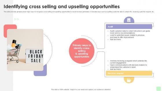 This slide provides glimpse about major ways to recognize cross selling and upselling opportunities to boost revenue generation. It includes ways such as auditing customer data to collect info, receiving customer request, etc. Dont compromise on a template that erodes your messages impact. Introducing our engaging Identifying Cross Selling Detailed Business Account PPT Template Strategy SS V complete deck, thoughtfully crafted to grab your audiences attention instantly. With this deck, effortlessly download and adjust elements, streamlining the customization process. Whether youre using Microsoft versions or Google Slides, it fits seamlessly into your workflow. Furthermore, its accessible in JPG, JPEG, PNG, and PDF formats, facilitating easy sharing and editing. Not only that you also play with the color theme of your slides making it suitable as per your audiences preference. This slide provides glimpse about major ways to recognize cross selling and upselling opportunities to boost revenue generation. It includes ways such as auditing customer data to collect info, receiving customer request, etc.