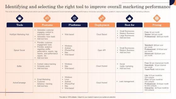 This slide shows four marketing tools which can be used by companies to boost marketing activities performance. It includes various features, platform, deployment and pricing of marketing software. Formulating a presentation can take up a lot of effort and time, so the content and message should always be the primary focus. The visuals of the PowerPoint can enhance the presenters message, so our Identifying And Selecting The Right Tool To Improve Strategic Marketing Campaign Slides Pdf was created to help save time. Instead of worrying about the design, the presenter can concentrate on the message while our designers work on creating the ideal templates for whatever situation is needed. Slidegeeks has experts for everything from amazing designs to valuable content, we have put everything into Identifying And Selecting The Right Tool To Improve Strategic Marketing Campaign Slides Pdf This slide shows four marketing tools which can be used by companies to boost marketing activities performance. It includes various features, platform, deployment and pricing of marketing software.