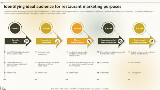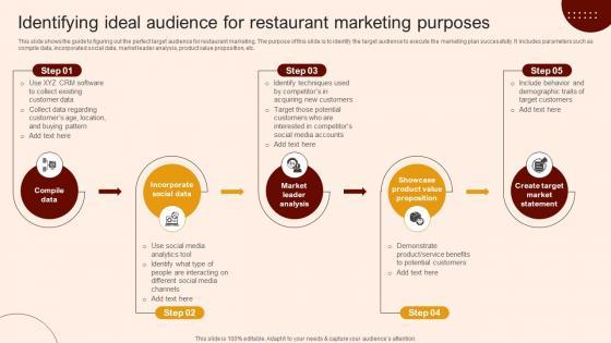 This slide shows the guide to figuring out the perfect target audience for restaurant marketing. The purpose of this slide is to identify the target audience to execute the marketing plan successfully. It includes parameters such as compile data, incorporated social data, market leader analysis, product value proposition, etc. If your project calls for a presentation, then Slidegeeks is your go-to partner because we have professionally designed, easy-to-edit templates that are perfect for any presentation. After downloading, you can easily edit Create A Restaurant Marketing Identifying Ideal Audience For Restaurant and make the changes accordingly. You can rearrange slides or fill them with different images. Check out all the handy templates This slide shows the guide to figuring out the perfect target audience for restaurant marketing. The purpose of this slide is to identify the target audience to execute the marketing plan successfully. It includes parameters such as compile data, incorporated social data, market leader analysis, product value proposition, etc.