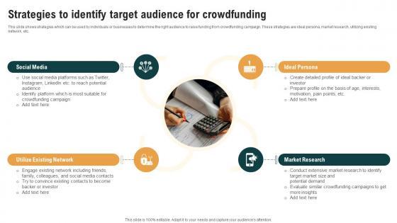 This slide shows strategies which can be used by individuals or businesses to determine the right audience to raise funding from crowdfunding campaign. These strategies are ideal persona, market research, utilizing existing network, etc. Do you have an important presentation coming up Are you looking for something that will make your presentation stand out from the rest Look no further than Strategies To Identify Target Audience For Crowdfunding Strategies To Raise Funds Fin SS V. With our professional designs, you can trust that your presentation will pop and make delivering it a smooth process. And with Slidegeeks, you can trust that your presentation will be unique and memorable. So why wait Grab Strategies To Identify Target Audience For Crowdfunding Strategies To Raise Funds Fin SS V today and make your presentation stand out from the rest This slide shows strategies which can be used by individuals or businesses to determine the right audience to raise funding from crowdfunding campaign. These strategies are ideal persona, market research, utilizing existing network, etc.