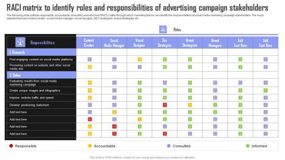 The following slide outlines responsible, accountable, consulted, and informed RACI matrix through which marketing teams can identify the responsibilities of social media marketing campaign stakeholders. The major stakeholders are content creator, social media manager, visual designer, SEO strategists, brand strategists, etc. Presenting this PowerPoint presentation, titled RACI Matrix Identify Brand Building Techniques To Gain Competitive Edge Pictures Pdf, with topics curated by our researchers after extensive research. This editable presentation is available for immediate download and provides attractive features when used. Download now and captivate your audience. Presenting this RACI Matrix Identify Brand Building Techniques To Gain Competitive Edge Pictures Pdf. Our researchers have carefully researched and created these slides with all aspects taken into consideration. This is a completely customizable RACI Matrix Identify Brand Building Techniques To Gain Competitive Edge Pictures Pdf that is available for immediate downloading. Download now and make an impact on your audience. Highlight the attractive features available with our PPTs. The following slide outlines responsible, accountable, consulted, and informed RACI matrix through which marketing teams can identify the responsibilities of social media marketing campaign stakeholders. The major stakeholders are content creator, social media manager, visual designer, SEO strategists, brand strategists, etc.