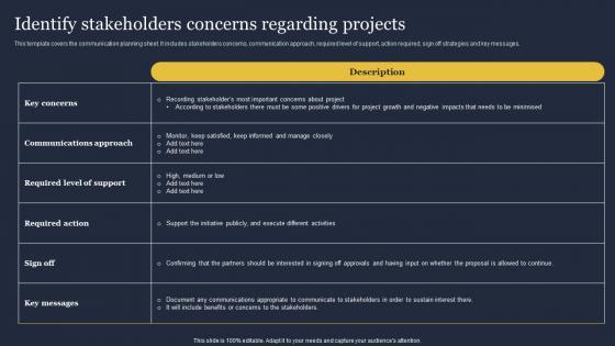 This template covers the communication planning sheet. It includes stakeholders concerns, communication approach, required level of support, action required, sign off strategies and key messages. Get a simple yet stunning designed Identify Stakeholders Concerns Regarding Critical Incident Communication Demonstration Pdf. It is the best one to establish the tone in your meetings. It is an excellent way to make your presentations highly effective. So, download this PPT today from Slidegeeks and see the positive impacts. Our easy to edit Identify Stakeholders Concerns Regarding Critical Incident Communication Demonstration Pdf can be your go to option for all upcoming conferences and meetings. So, what are you waiting for Grab this template today. This template covers the communication planning sheet. It includes stakeholders concerns, communication approach, required level of support, action required, sign off strategies and key messages.