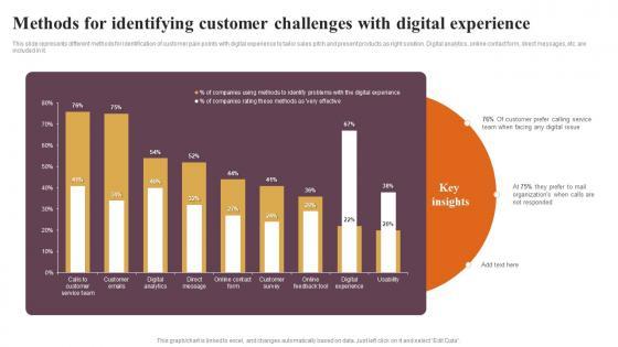 This slide represents different methods for identification of customer pain points with digital experience to tailor sales pitch and present products as right solution. Digital analytics, online contact form, direct messages, etc. are included in it. Pitch your topic with ease and precision using this Methods For Identifying Customer Challenges With Digital Experience Introduction Pdf This layout presents information on Methods For Identifying, Customer Challenges, Digital Experience It is also available for immediate download and adjustment. So, changes can be made in the color, design, graphics or any other component to create a unique layout. This slide represents different methods for identification of customer pain points with digital experience to tailor sales pitch and present products as right solution. Digital analytics, online contact form, direct messages, etc. are included in it.