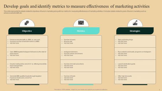 This slide represents the details related to objectives of tourism marketing along with key metrics for measuring effectiveness of marketing activities. It includes details related to goals of tourism marketing such as enhance website traffic etc. If your project calls for a presentation, then Slidegeeks is your go-to partner because we have professionally designed, easy-to-edit templates that are perfect for any presentation. After downloading, you can easily edit Guide To Winning Tourism Develop Goals And Identify Metrics To Measure Effectiveness Mockup Pdf and make the changes accordingly. You can rearrange slides or fill them with different images. Check out all the handy templates This slide represents the details related to objectives of tourism marketing along with key metrics for measuring effectiveness of marketing activities. It includes details related to goals of tourism marketing such as enhance website traffic etc.
