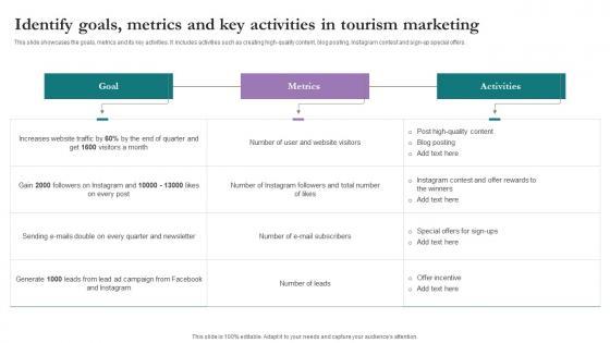 This slide showcases the goals, metrics and its key activities. It includes activities such as creating high-quality content, blog posting, Instagram contest and sign-up special offers. Do you have an important presentation coming up Are you looking for something that will make your presentation stand out from the rest Look no further than Identify Goals Metrics And Key Activities In Tourism Marketing Ideas PDF. With our professional designs, you can trust that your presentation will pop and make delivering it a smooth process. And with Slidegeeks, you can trust that your presentation will be unique and memorable. So why wait Grab Identify Goals Metrics And Key Activities In Tourism Marketing Ideas PDF today and make your presentation stand out from the rest.
