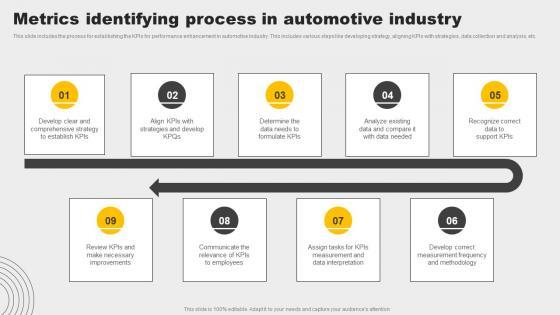 This slide includes the process for establishing the KPIs for performance enhancement in automotive industry. This includes various steps like developing strategy, aligning KPIs with strategies, data collection and analysis, etc. Pitch your topic with ease and precision using this Metrics Identifying Process In Automotive Industry Download Pdf. This layout presents information on Develop, Comprehensive Strategy, Determine. It is also available for immediate download and adjustment. So, changes can be made in the color, design, graphics or any other component to create a unique layout. This slide includes the process for establishing the KPIs for performance enhancement in automotive industry. This includes various steps like developing strategy, aligning KPIs with strategies, data collection and analysis, etc.