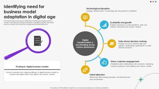This slide analyzes the need of shifting from traditional to digital business models. It includes technological disruption, scalability and growth, data-driven decision making, direct customer engagement and talent attraction.Present like a pro with Identifying Need For Business Model Adaptation In Digital Age DT SS V. Create beautiful presentations together with your team, using our easy-to-use presentation slides. Share your ideas in real-time and make changes on the fly by downloading our templates. So whether you are in the office, on the go, or in a remote location, you can stay in sync with your team and present your ideas with confidence. With Slidegeeks presentation got a whole lot easier. Grab these presentations today. This slide analyzes the need of shifting from traditional to digital business models. It includes technological disruption, scalability and growth, data-driven decision making, direct customer engagement and talent attraction.