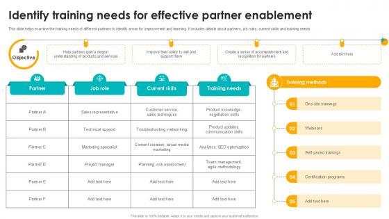 This slide helps examine the training needs of different partners to identify areas for improvement and learning. It includes details about partners, job roles, current skills and training needs. From laying roadmaps to briefing everything in detail, our templates are perfect for you. You can set the stage with your presentation slides. All you have to do is download these easy-to-edit and customizable templates. Identify Training Needs For Effective Partner Enablement Partner Relationship Ppt Template will help you deliver an outstanding performance that everyone would remember and praise you for. Do download this presentation today. This slide helps examine the training needs of different partners to identify areas for improvement and learning. It includes details about partners, job roles, current skills and training needs.