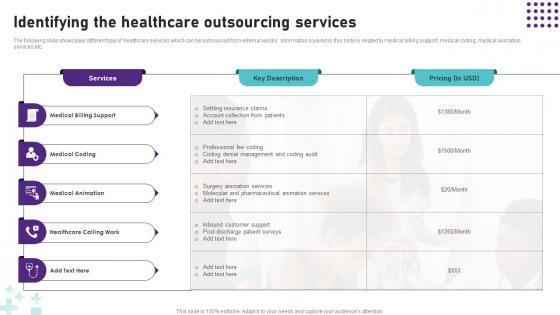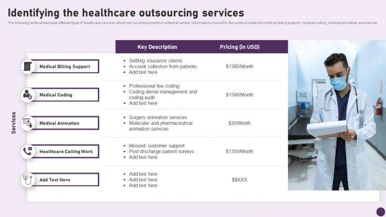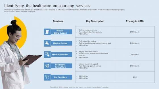 The following slide showcases different type of healthcare services which can be outsourced from external vendor. Information covered in this slide is related to medical billing support, medical coding, medical animation services etc. Welcome to our selection of the Identifying The Healthcare Outsourcing Services Diagrams PDF. These are designed to help you showcase your creativity and bring your sphere to life. Planning and Innovation are essential for any business that is just starting out. This collection contains the designs that you need for your everyday presentations. All of our PowerPoints are 100 percent editable, so you can customize them to suit your needs. This multi purpose template can be used in various situations. Grab these presentation templates today.