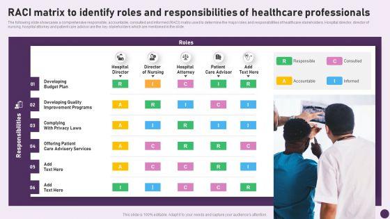 The following slide showcases a comprehensive responsible, accountable, consulted and informed RACI matrix used to determine the major roles and responsibilities of healthcare stakeholders. Hospital director, director of nursing, hospital attorney and patient care advisor are the key stakeholders which are mentioned in the slide. Want to ace your presentation in front of a live audience Our Guide To Healthcare Services Administration RACI Matrix To Identify Roles And Responsibilities Of Healthcare Diagrams PDF can help you do that by engaging all the users towards you. Slidegeeks experts have put their efforts and expertise into creating these impeccable powerpoint presentations so that you can communicate your ideas clearly. Moreover, all the templates are customizable, and easy to edit and downloadable. Use these for both personal and commercial use.