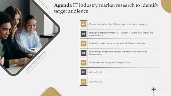 Find a pre-designed and impeccable Agenda IT Industry Market Research To Identify Target Audience Portrait Pdf. The templates can ace your presentation without additional effort. You can download these easy-to-edit presentation templates to make your presentation stand out from others. So, what are you waiting for Download the template from Slidegeeks today and give a unique touch to your presentation. Our Agenda IT Industry Market Research To Identify Target Audience Portrait Pdf are topically designed to provide an attractive backdrop to any subject. Use them to look like a presentation pro.