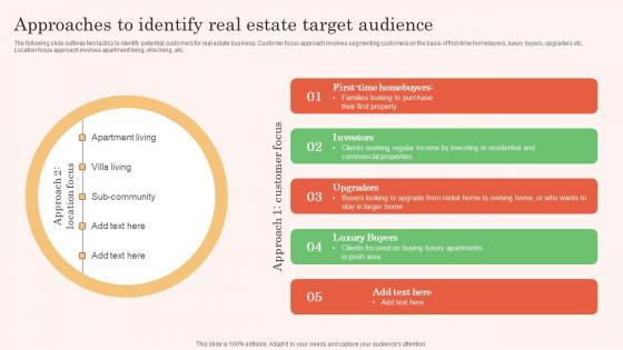 The following slide outlines two tactics to identify potential customers for real estate business. Customer focus approach involves segmenting customers on the basis of first-time homebuyers, luxury buyers, upgraders etc. Location focus approach involves apartment living, villa living, etc.Create an editable Approaches To Identify Real Estate Target Audience Real Estate Property Marketing Summary Pdf that communicates your idea and engages your audience. Whether you are presenting a business or an educational presentation, pre-designed presentation templates help save time. Approaches To Identify Real Estate Target Audience Real Estate Property Marketing Summary Pdf is highly customizable and very easy to edit, covering many different styles from creative to business presentations. Slidegeeks has creative team members who have crafted amazing templates. So, go and get them without any delay. The following slide outlines two tactics to identify potential customers for real estate business. Customer focus approach involves segmenting customers on the basis of first-time homebuyers, luxury buyers, upgraders etc. Location focus approach involves apartment living, villa living, etc.