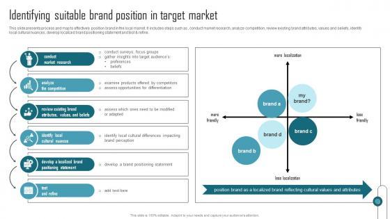 This slide presents process and map to effectively position brand in the local market. It includes steps such as , conduct market research, analyze competition, review existing brand attributes, values and beliefs, identify local cultural nuances, develop localized brand positioning statement and test And refine. The Effective Product Adaptation Identifying Suitable Brand Position In Target Market Portrait PDF is a compilation of the most recent design trends as a series of slides. It is suitable for any subject or industry presentation, containing attractive visuals and photo spots for businesses to clearly express their messages. This template contains a variety of slides for the user to input data, such as structures to contrast two elements, bullet points, and slides for written information. Slidegeeks is prepared to create an impression. This slide presents process and map to effectively position brand in the local market. It includes steps such as , conduct market research, analyze competition, review existing brand attributes, values and beliefs, identify local cultural nuances, develop localized brand positioning statement and test And refine.