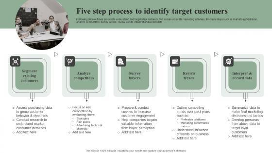 Following slide outlines process to understand and target ideal audience that assure accurate marketing activities, it include steps such as market segmentation, analyze competitors, survey buyers, review trends, interpret and record data. Formulating a presentation can take up a lot of effort and time, so the content and message should always be the primary focus. The visuals of the PowerPoint can enhance the presenters message, so our Five Step Process To Identify Target Customers Efficient Marketing Tactics Background Pdf was created to help save time. Instead of worrying about the design, the presenter can concentrate on the message while our designers work on creating the ideal templates for whatever situation is needed. Slidegeeks has experts for everything from amazing designs to valuable content, we have put everything into Five Step Process To Identify Target Customers Efficient Marketing Tactics Background Pdf Following slide outlines process to understand and target ideal audience that assure accurate marketing activities, it include steps such as market segmentation, analyze competitors, survey buyers, review trends, interpret and record data.