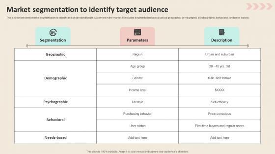 This slide represents market segmentation to identify and understand target customers in the market. It includes segmentation basis such as geographic, demographic, psychographic, behavioral, and need-based. This Market Segmentation To Identify Target Audience Promotional Strategies To Increase Information PDF is perfect for any presentation, be it in front of clients or colleagues. It is a versatile and stylish solution for organizing your meetings. The Market Segmentation To Identify Target Audience Promotional Strategies To Increase Information PDF features a modern design for your presentation meetings. The adjustable and customizable slides provide unlimited possibilities for acing up your presentation. Slidegeeks has done all the homework before launching the product for you. So, do not wait, grab the presentation templates today This slide represents market segmentation to identify and understand target customers in the market. It includes segmentation basis such as geographic, demographic, psychographic, behavioral, and need-based.