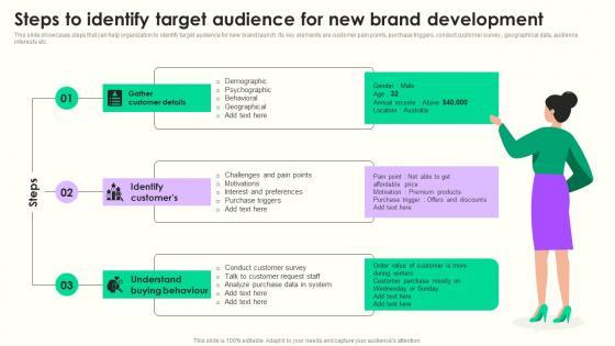 This slide showcases steps that can help organization to identify target audience for new brand launch. Its key elements are customer pain points, purchase triggers, conduct customer survey,, geographical data, audience interests etc. Are you searching for a Brand Marketing Strategy Steps To Identify Target Audience For New Brand Template PDF that is uncluttered, straightforward, and original Its easy to edit, and you can change the colors to suit your personal or business branding. For a presentation that expresses how much effort youve put in, this template is ideal With all of its features, including tables, diagrams, statistics, and lists, its perfect for a business plan presentation. Make your ideas more appealing with these professional slides. Download Brand Marketing Strategy Steps To Identify Target Audience For New Brand Template PDF from Slidegeeks today.