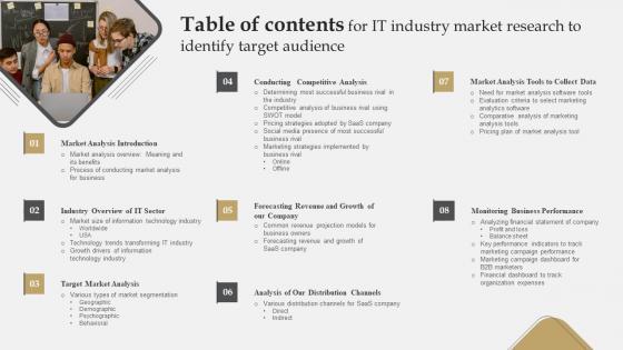 Slidegeeks has constructed Table Of Contents For IT Industry Market Research To Identify Target Audience Designs Pdf after conducting extensive research and examination. These presentation templates are constantly being generated and modified based on user preferences and critiques from editors. Here, you will find the most attractive templates for a range of purposes while taking into account ratings and remarks from users regarding the content. This is an excellent jumping-off point to explore our content and will give new users an insight into our top-notch PowerPoint Templates. Our Table Of Contents For IT Industry Market Research To Identify Target Audience Designs Pdf are topically designed to provide an attractive backdrop to any subject. Use them to look like a presentation pro.