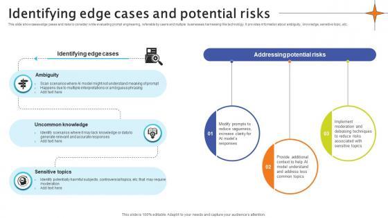 This slide showcases edge cases and risks to consider while evaluating prompt engineering, referable by users and multiple businesses harnessing this technology. It provides information about ambiguity, knowledge, sensitive topic, etc. This modern and well-arranged Identifying Edge Cases And Potential Risks Crafting Interactions A Guide AI SS V provides lots of creative possibilities. It is very simple to customize and edit with the Powerpoint Software. Just drag and drop your pictures into the shapes. All facets of this template can be edited with Powerpoint, no extra software is necessary. Add your own material, put your images in the places assigned for them, adjust the colors, and then you can show your slides to the world, with an animated slide included. This slide showcases edge cases and risks to consider while evaluating prompt engineering, referable by users and multiple businesses harnessing this technology. It provides information about ambiguity, knowledge, sensitive topic, etc.
