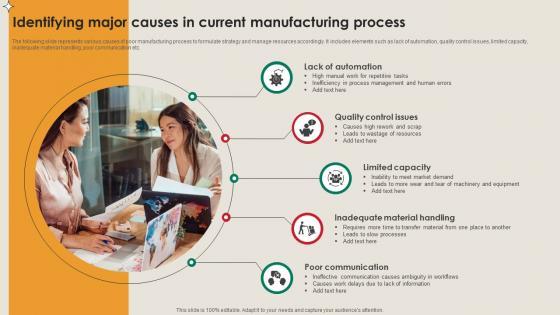 The following slide represents various causes of poor manufacturing process to formulate strategy and manage resources accordingly. It includes elements such as lack of automation, quality control issues, limited capacity, inadequate material handling, poor communication etc. Make sure to capture your audiences attention in your business displays with our gratis customizable Identifying Major Causes In Current Manufacturing Automating Production Process Strategy SS V. These are great for business strategies, office conferences, capital raising or task suggestions. If you desire to acquire more customers for your tech business and ensure they stay satisfied, create your own sales presentation with these plain slides. The following slide represents various causes of poor manufacturing process to formulate strategy and manage resources accordingly. It includes elements such as lack of automation, quality control issues, limited capacity, inadequate material handling, poor communication etc.