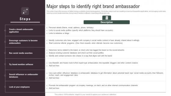 This slide covers the process of determining a suitable brand spokesperson. It includes steps such as creating a brand ambassador application, encouraging customers, running social media searches, trying brand mention software, searching influencers, etc. Are you searching for a Major Steps To Identify Right Brand Ambassador Tracking Word Mouth Marketing Topics PDF that is uncluttered, straightforward, and original Its easy to edit, and you can change the colors to suit your personal or business branding. For a presentation that expresses how much effort you have put in, this template is ideal With all of its features, including tables, diagrams, statistics, and lists, its perfect for a business plan presentation. Make your ideas more appealing with these professional slides. Download Major Steps To Identify Right Brand Ambassador Tracking Word Mouth Marketing Topics PDF from Slidegeeks today. This slide covers the process of determining a suitable brand spokesperson. It includes steps such as creating a brand ambassador application, encouraging customers, running social media searches, trying brand mention software, searching influencers, etc.