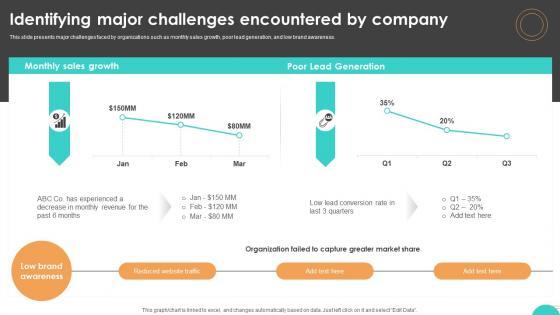 This slide presents major challenges faced by organizations such as monthly sales growth, poor lead generation, and low brand awareness. The Ultimate Guide To Cold Identifying Major Challenges Encountered SA SS V is a compilation of the most recent design trends as a series of slides. It is suitable for any subject or industry presentation, containing attractive visuals and photo spots for businesses to clearly express their messages. This template contains a variety of slides for the user to input data, such as structures to contrast two elements, bullet points, and slides for written information. Slidegeeks is prepared to create an impression. This slide presents major challenges faced by organizations such as monthly sales growth, poor lead generation, and low brand awareness.