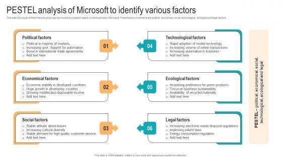 This slide shows six different factors which can have a direct or indirect impact on the business of microsoft. These factors or elements are political, economical, social, technological, ecological and legal factors. This Micosoft Intensive Growth Pestel Analysis Of Microsoft To Identify Various Factors Strategy SS V from Slidegeeks makes it easy to present information on your topic with precision. It provides customization options, so you can make changes to the colors, design, graphics, or any other component to create a unique layout. It is also available for immediate download, so you can begin using it right away. Slidegeeks has done good research to ensure that you have everything you need to make your presentation stand out. Make a name out there for a brilliant performance. This slide shows six different factors which can have a direct or indirect impact on the business of microsoft. These factors or elements are political, economical, social, technological, ecological and legal factors.
