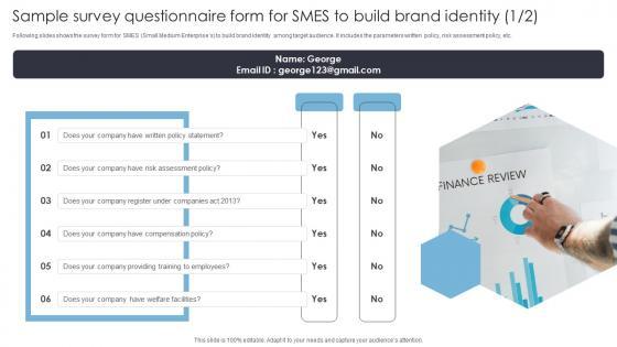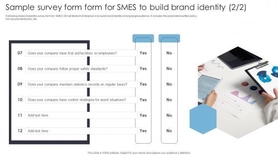 Following slides shows the survey form for SMES Small Medium Enterprises to build brand identity among target audience. It includes the parameters written policy, risk assessment policy, etc. Pitch your topic with ease and precision using this Sample Survey Questionnaire Form For SMES To Build Brand Identity Survey SS. This layout presents information on Policy Statement, Risk Assessment, Register Under Companies. It is also available for immediate download and adjustment. So, changes can be made in the color, design, graphics or any other component to create a unique layout. Following slides shows the survey form for SMES Small Medium Enterprises to build brand identity among target audience. It includes the parameters written policy, risk assessment policy, etc.