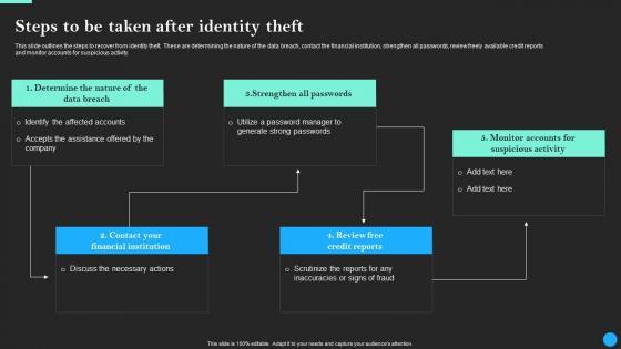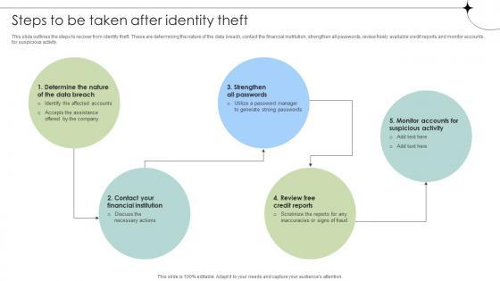 Do you have to make sure that everyone on your team knows about any specific topic I yes, then you should give Steps To Be Taken After Identity Theft Data Breach Prevention Microsoft Pdf a try. Our experts have put a lot of knowledge and effort into creating this impeccable Steps To Be Taken After Identity Theft Data Breach Prevention Microsoft Pdf. You can use this template for your upcoming presentations, as the slides are perfect to represent even the tiniest detail. You can download these templates from the Slidegeeks website and these are easy to edit. So grab these today This slide outlines the steps to recover from identity theft. These are determining the nature of the data breach, contact the financial institution, strengthen all passwords, review freely available credit reports and monitor accounts for suspicious activity.