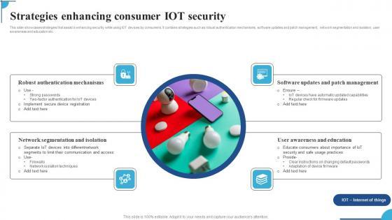 This slide showcases strategies that assist in enhancing security while using IOT devices by consumers. It contains strategies such as robust authentication mechanisms,software updates and patch management,network segmentation and isolation,user awareness and education etc. Pitch your topic with ease and precision using this Strategies Enhancing Consumer IOT Security Ppt Pictures Graphic Images Pdf. This layout presents information on Robust Authentication Mechanisms,Network Segmentation Isolation,Software Updates. It is also available for immediate download and adjustment. So,changes can be made in the color,design,graphics or any other component to create a unique layout. This slide showcases strategies that assist in enhancing security while using IOT devices by consumers. It contains strategies such as robust authentication mechanisms,software updates and patch management,network segmentation and isolation,user awareness and education etc.