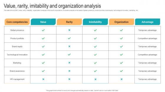 This slide shows VRIO value, rarity, imitability, organization analysis of microsoft corporations. It includes analysis on the basis of global presence, product portfolio, brand equity, technological innovation, marketing, etc. If your project calls for a presentation, then Slidegeeks is your go-to partner because we have professionally designed, easy-to-edit templates that are perfect for any presentation. After downloading, you can easily edit Micosoft Intensive Growth Value Rarity Imitability And Organization Analysis Strategy SS V and make the changes accordingly. You can rearrange slides or fill them with different images. Check out all the handy templates This slide shows VRIO value, rarity, imitability, organization analysis of microsoft corporations. It includes analysis on the basis of global presence, product portfolio, brand equity, technological innovation, marketing, etc.
