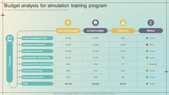 This slide showcase gap analysis of budget allocated for simulation training program along with status. There are so many reasons you need a Immersive Training For Practical Budget Analysis For Simulation Training Program DTE SS V. The first reason is you can not spend time making everything from scratch, Thus, Slidegeeks has made presentation templates for you too. You can easily download these templates from our website easily. This slide showcase gap analysis of budget allocated for simulation training program along with status.