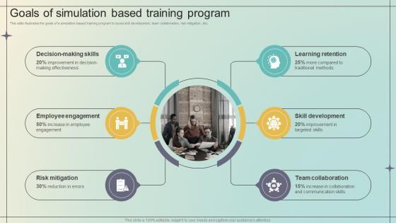 This slide illustrates the goals of a simulation-based training program to boost skill development, team collaboration, risk mitigation, etc. Whether you have daily or monthly meetings, a brilliant presentation is necessary. Immersive Training For Practical Goals Of Simulation Based Training Program DTE SS V can be your best option for delivering a presentation. Represent everything in detail using Immersive Training For Practical Goals Of Simulation Based Training Program DTE SS V and make yourself stand out in meetings. The template is versatile and follows a structure that will cater to your requirements. All the templates prepared by Slidegeeks are easy to download and edit. Our research experts have taken care of the corporate themes as well. So, give it a try and see the results. This slide illustrates the goals of a simulation-based training program to boost skill development, team collaboration, risk mitigation, etc.