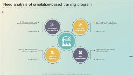 This slide illustrates need analysis of simulation-based training program such as risk free environment, resource efficiency, assent and feedback etc. Crafting an eye-catching presentation has never been more straightforward. Let your presentation shine with this tasteful yet straightforward Immersive Training For Practical Need Analysis Of Simulation Based Training Program DTE SS V template. It offers a minimalistic and classy look that is great for making a statement. The colors have been employed intelligently to add a bit of playfulness while still remaining professional. Construct the ideal Immersive Training For Practical Need Analysis Of Simulation Based Training Program DTE SS V that effortlessly grabs the attention of your audience Begin now and be certain to wow your customers This slide illustrates need analysis of simulation-based training program such as risk free environment, resource efficiency, assent and feedback etc.