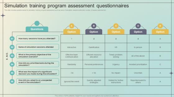 This slide includes questionnaires for simulation training program assessment such as name of simulation sessions attended, number of session attended etc. Welcome to our selection of the Immersive Training For Practical Simulation Training Program Assessment Questionnaires DTE SS V. These are designed to help you showcase your creativity and bring your sphere to life. Planning and Innovation are essential for any business that is just starting out. This collection contains the designs that you need for your everyday presentations. All of our PowerPoints are 100Percent editable, so you can customize them to suit your needs. This multi-purpose template can be used in various situations. Grab these presentation templates today. This slide includes questionnaires for simulation training program assessment such as name of simulation sessions attended, number of session attended etc.